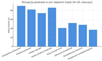 Graf, ki ga prikazujemo v nadaljevanju, prikazuje delež omemb izbranih prednosti in ovir. Najvišje ocenjena motiva sta energetska učinkovitost (≈90 % omemb) in okoljska prijaznost (≈80 %), najpogostejši oviri pa visoka začetna investicija (≈86 %), odvisnost od elektrike (≈52 %) ter kompleksnost subvencijskih postopkov (≈48 %). Zabeležena je bila tudi dostopnost izvajalcev (≈37 %), kar sovpada s poročili o zasičenosti montažnih kapacitet v obdobjih povpraševanja.